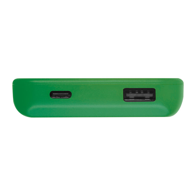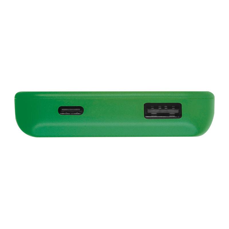 Power bank (10,000 mAh) made of recycled plastic (RABS) with two ports: USB-C in/out 5V/2.1A and USB-A out 5V/2.1A. Includes 50 cm charging cable.