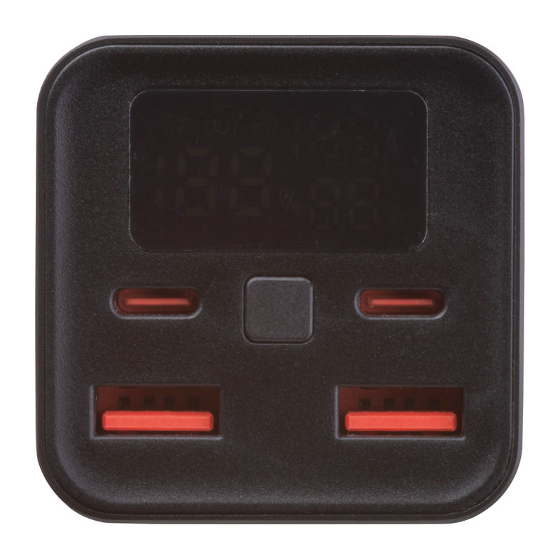 Power bank with 20.000 mAh capacity and 70 W total output. Features an LCD display and soft rubber finish. Includes cable (USB to USB-C).