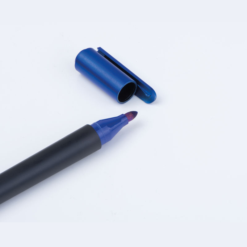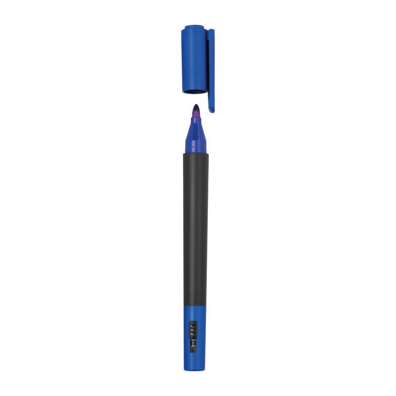 2-in-1 cutter with felt tip pen made of plastic. The pen writes in the color of the cap.