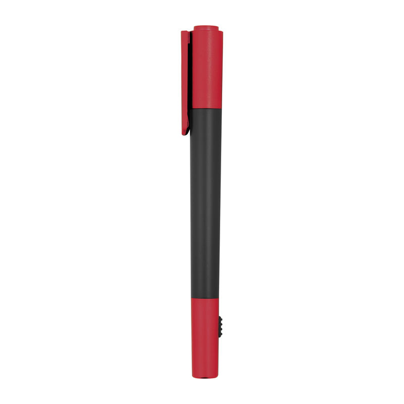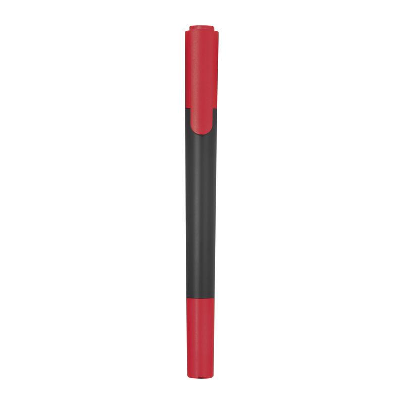 2-in-1 cutter with felt tip pen made of plastic. The pen writes in the color of the cap.