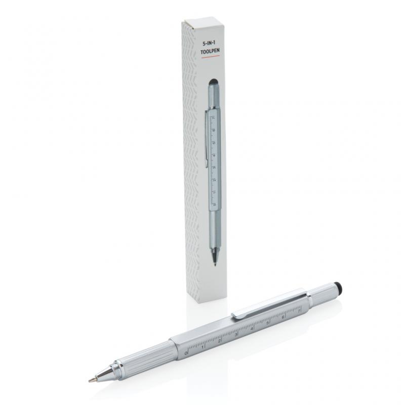 Multifunction pen with ruler (7cm) , spirit level, screw driver, stylus tip and ballpoint with blue writing ink (up to 400m) Made out of high quality brass material with aluminium clip.