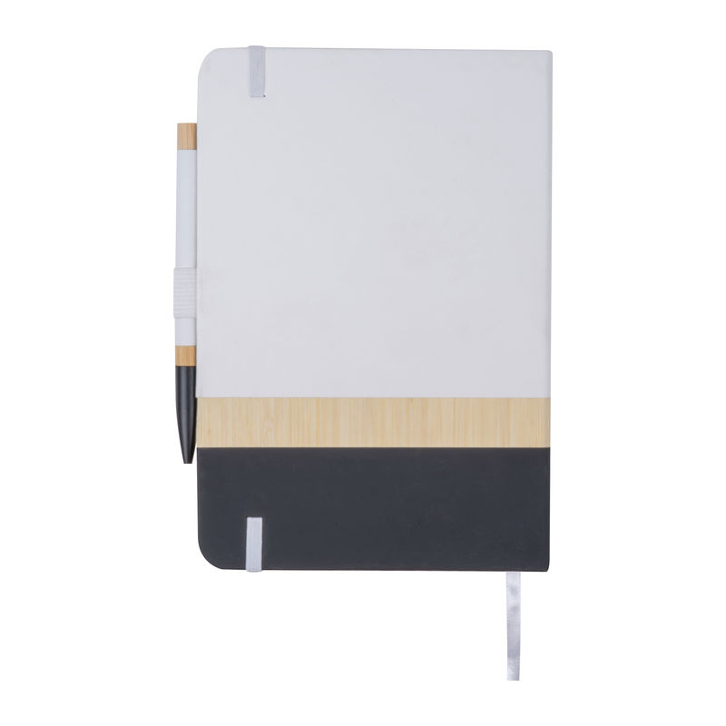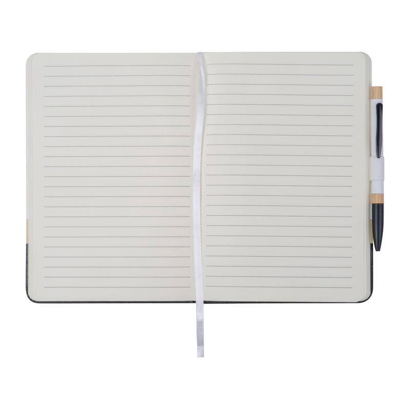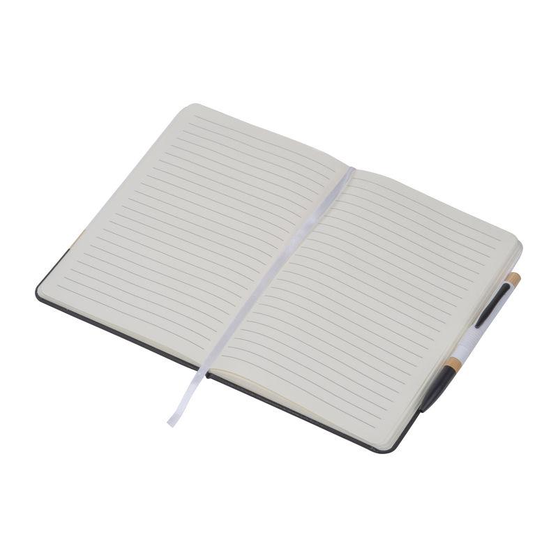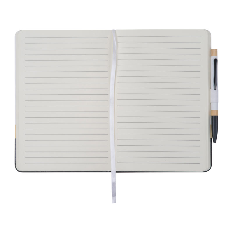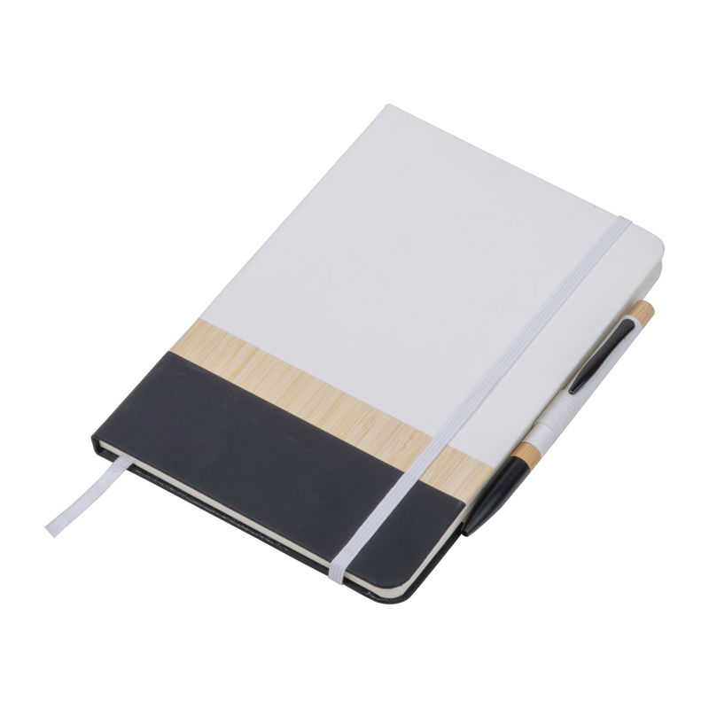A5 notebook with ballpoint pen. The notebook is made of recycled paper (160 lined pages), bamboo, and PU. The matching pen is made of aluminum and bamboo. Perfect for notes, ideas, sketches, and more. Your logo will be printed on the notebook.