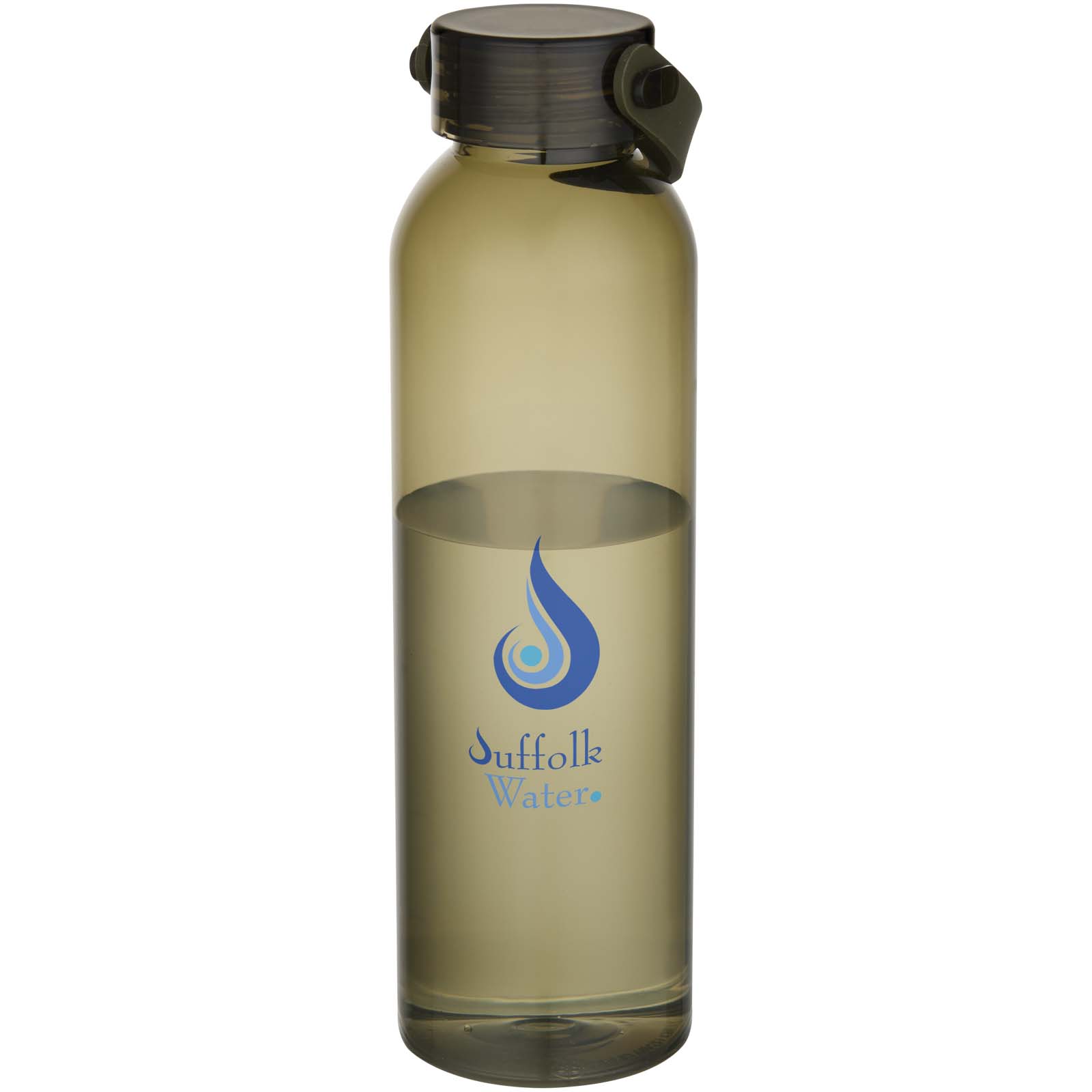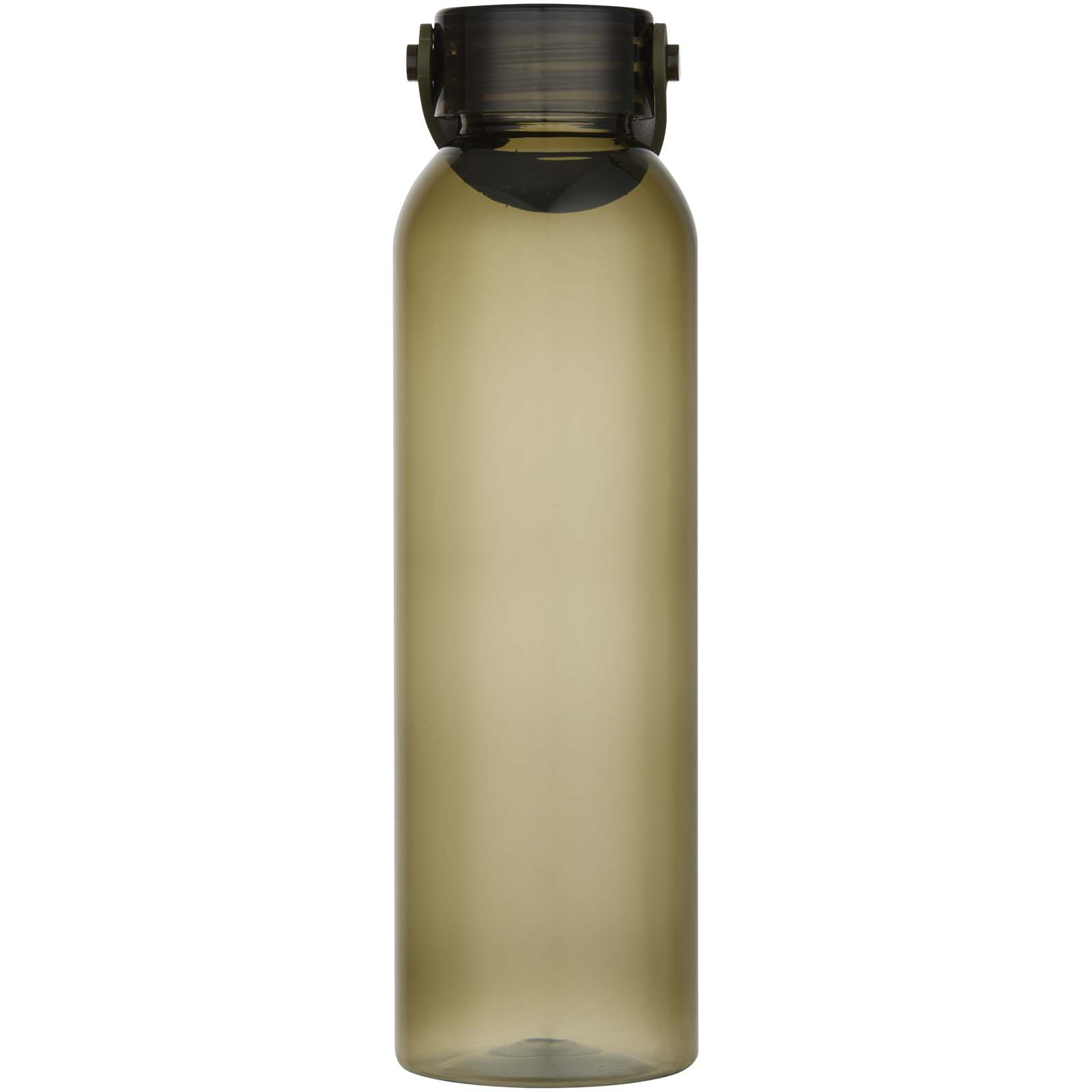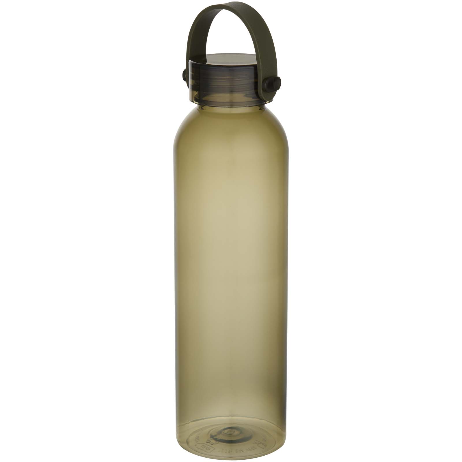 Water bottle made from RCS certified RPET, featuring a convenient silicone carry handle. In compliance with the EFSA approved PET recycling process. Volume capacity: 630 ml.