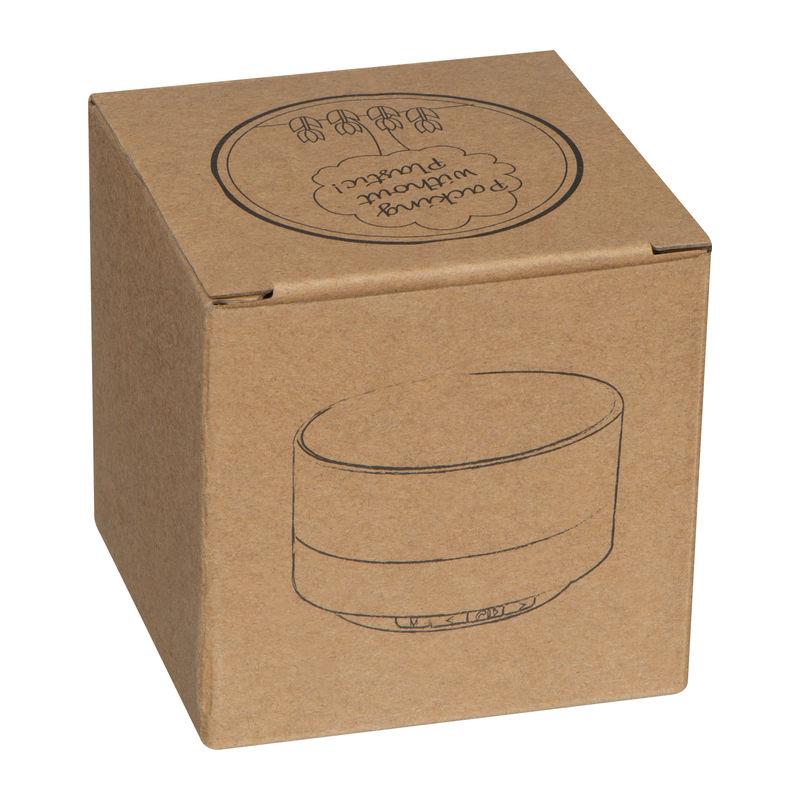 Round aluminum Bluetooth speaker with built-in battery, built-in radio and flashing LED light on the bottom. Micro USB charging cable is included. Running time: 40-70min, charging time: 2h, max. range approx. 10m. Your logo will be lasered on the outside of the speaker.