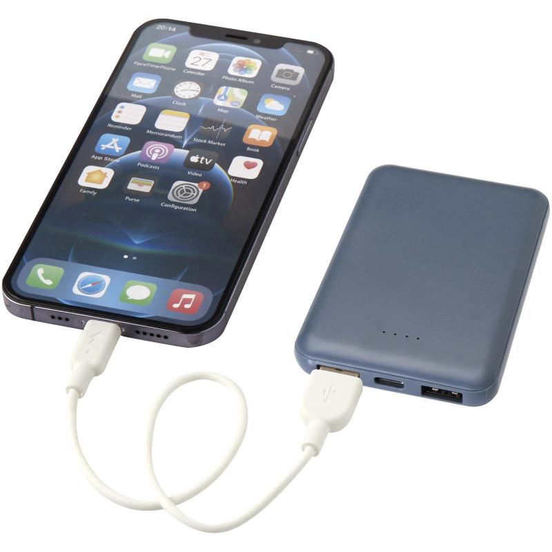 Power bank with slim and elegant design and Type-C in/output port and 2x USB-A ports which means that 3 devices can be charged simultaneously. The power bank features a 5000 mAh lithium polymer battery which delivers a total output power of max. 10W. This power bank is made of 23% RCS certified recycled plastic. Delivered with a TPE Type-C to USB-A charging cable.