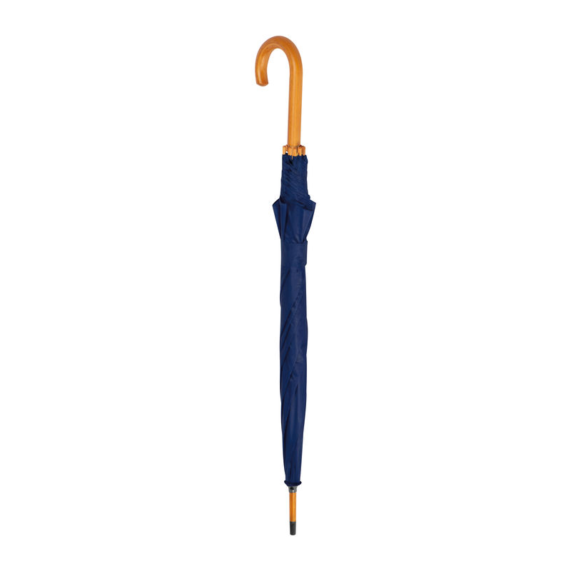 Automatic umbrella with curved wooden handle and wooden tip. We will print your logo on one segment. Full-colour print on request.