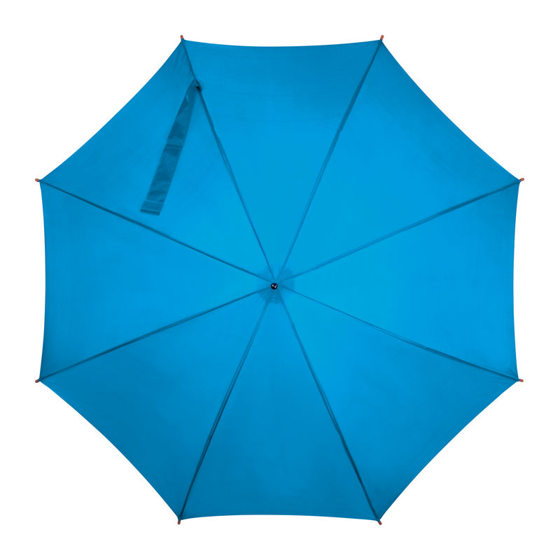 Automatic umbrella with curved wooden handle and wooden tip. We will print your logo on one segment. Full-colour print on request.
