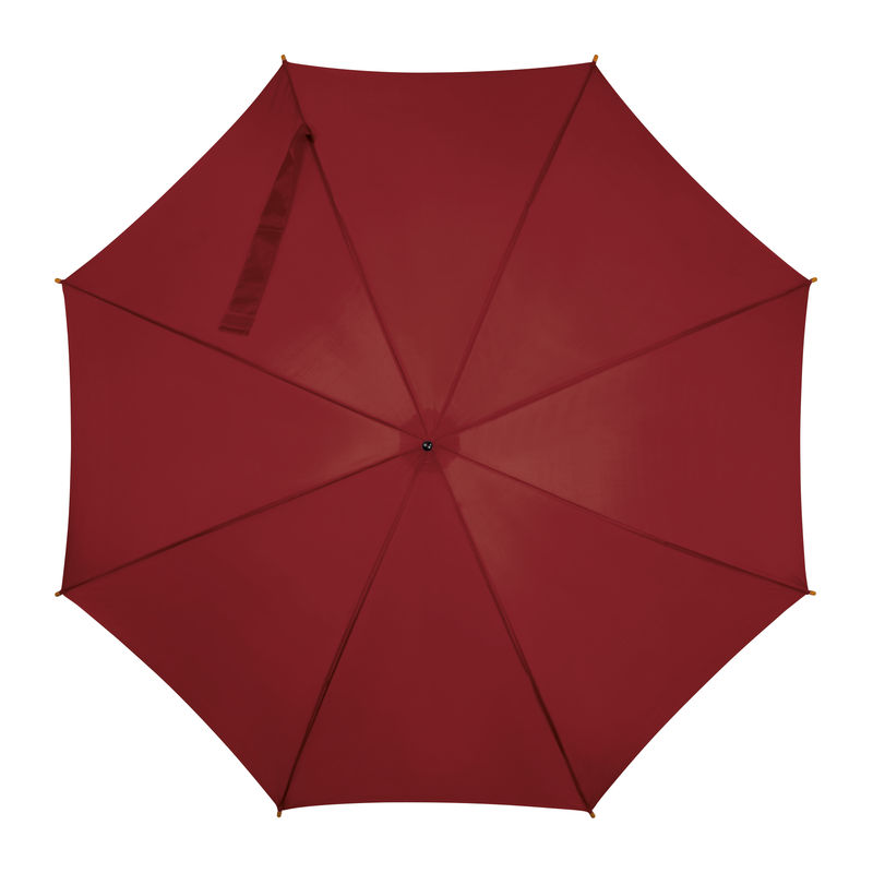 Automatic umbrella with curved wooden handle and wooden tip. We will print your logo on one segment. Full-colour print on request.