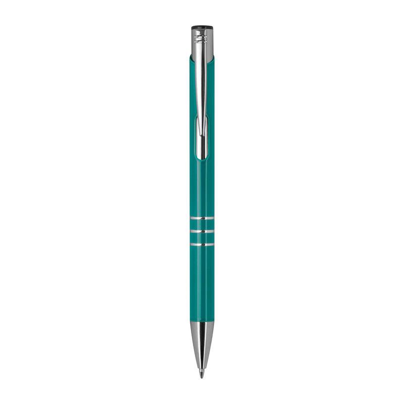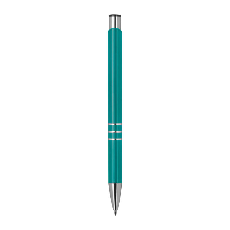 Fully lacquered metal ball pen with 3 decorative rings and blue-writing refill with large capacity. Your logo will be engraved to the right of the clip.