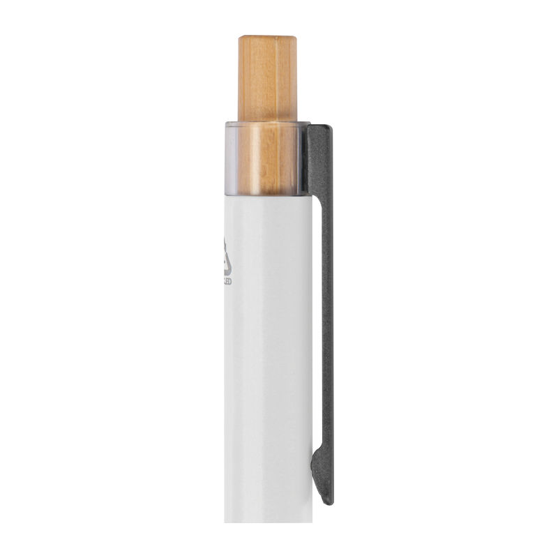 Recycled aluminium ballpen with metal clip, blue refill and bamboo pusher. Your logo will be engraved below the clip.