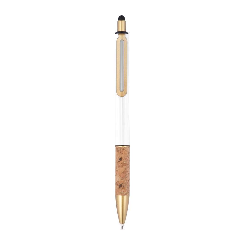Metal ball pen with golden applications, blue-writing refill and cork grip zone. Your logo will be engraved to the right of the clip.