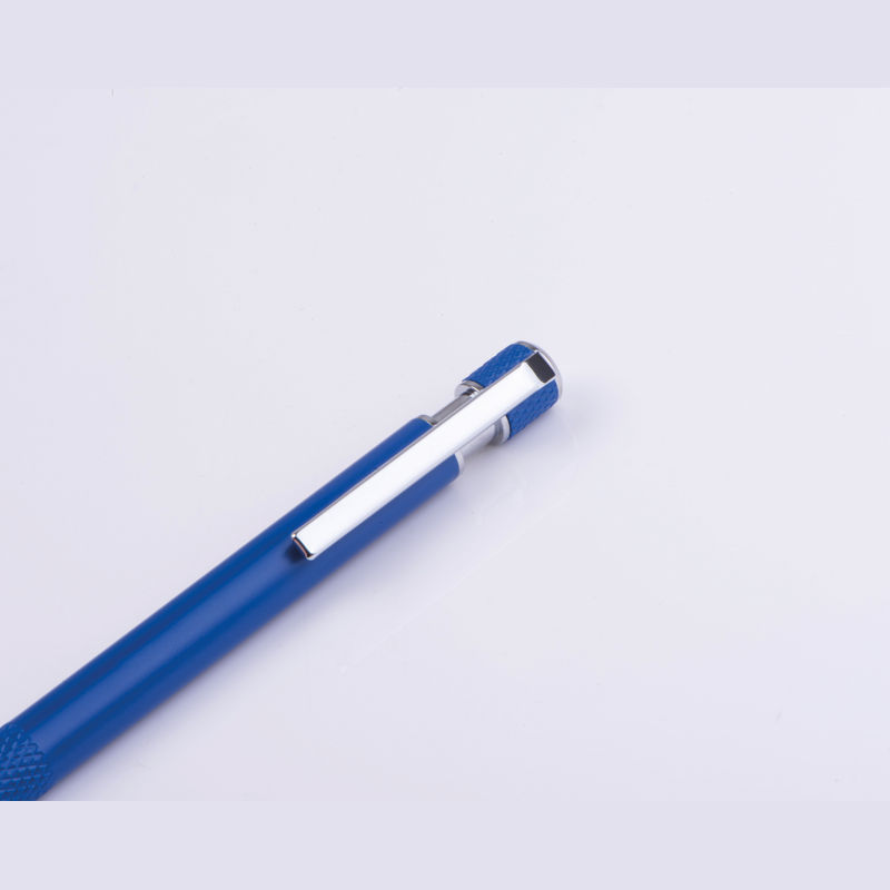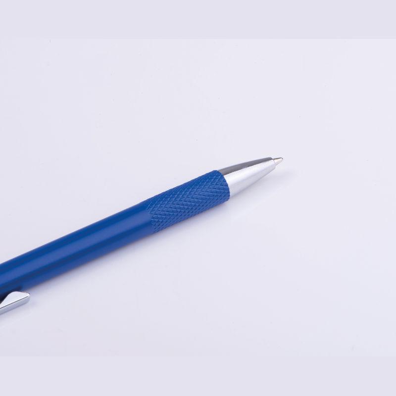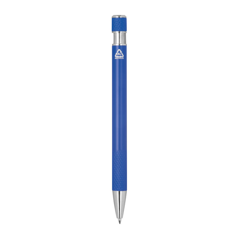 Ballpoint pen made from recycled aluminum with patterned grip zone, push mechanism, and blue ink.