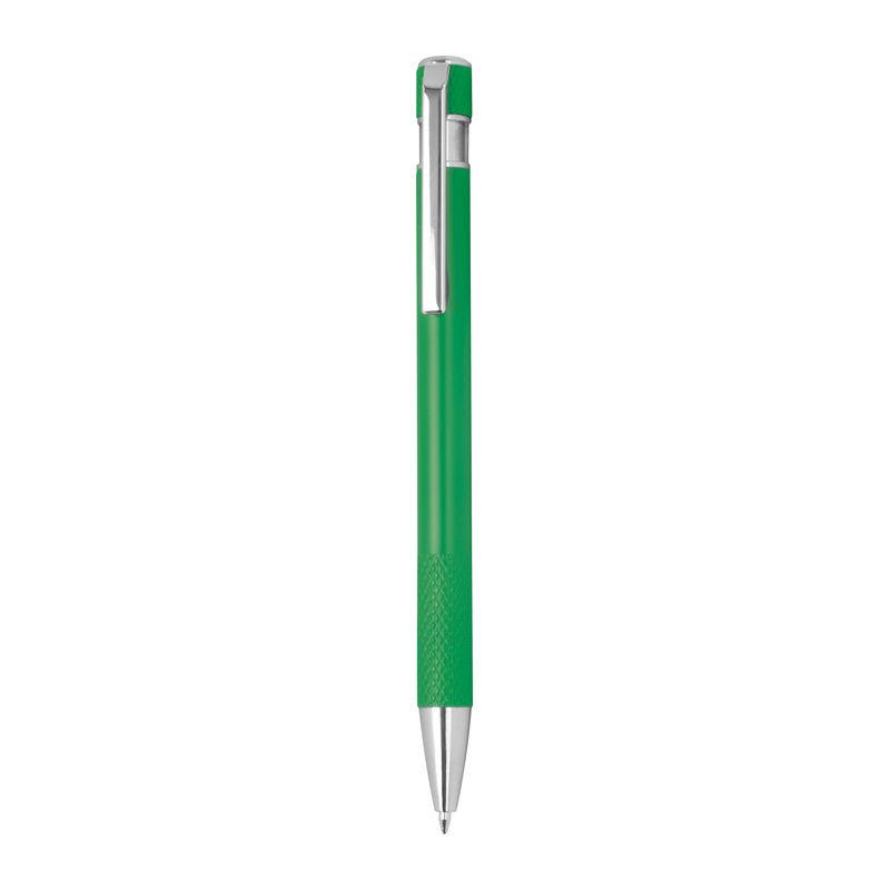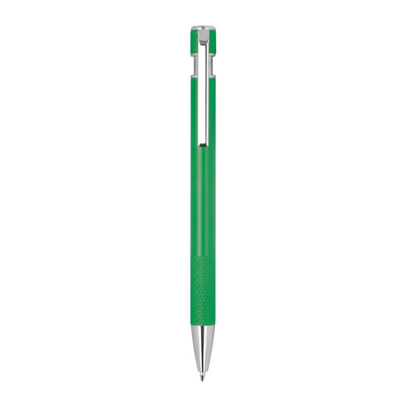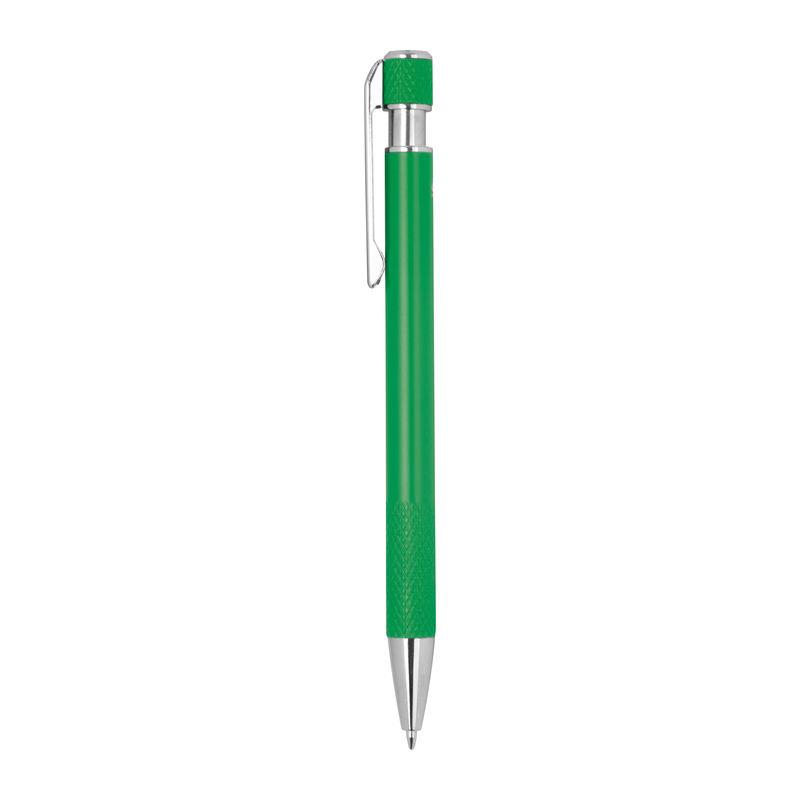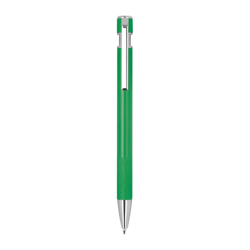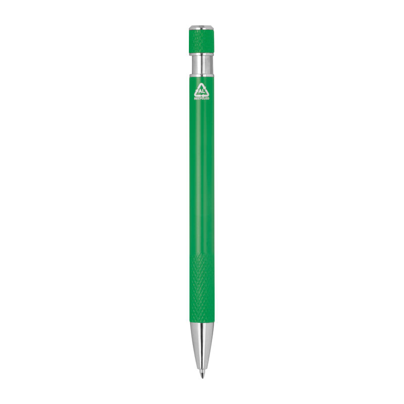 Ballpoint pen made from recycled aluminum with patterned grip zone, push mechanism, and blue ink.