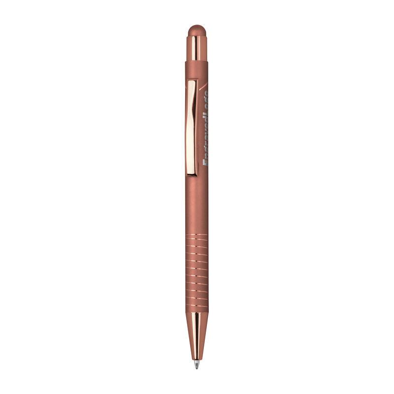 Ballpoint pen with integrated touch pen for smartphones and tablets. Features a glossy color-mirror finish, blue ink.