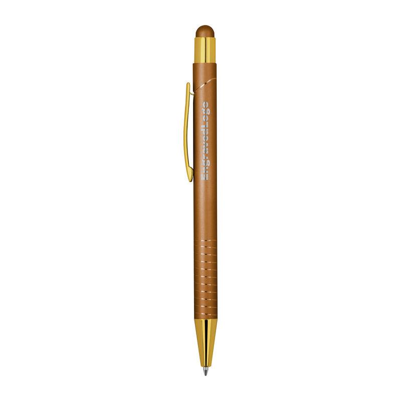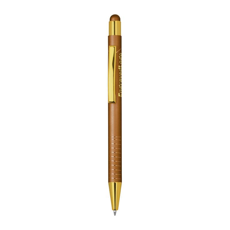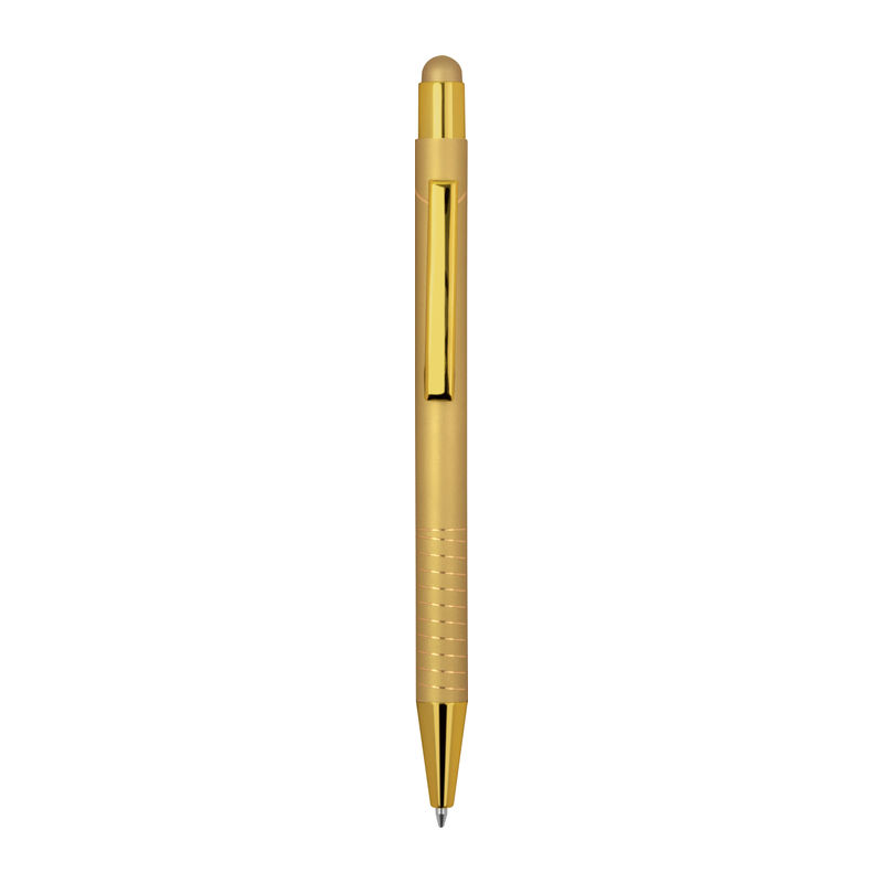 Ballpoint pen with integrated touch pen for smartphones and tablets. Features a glossy color-mirror finish, blue ink.