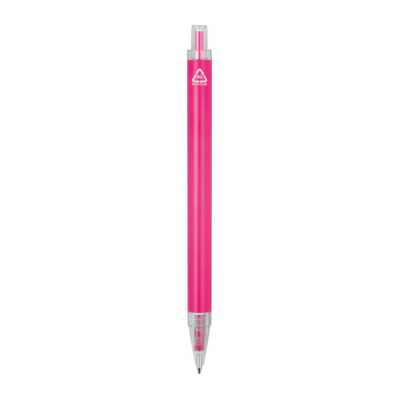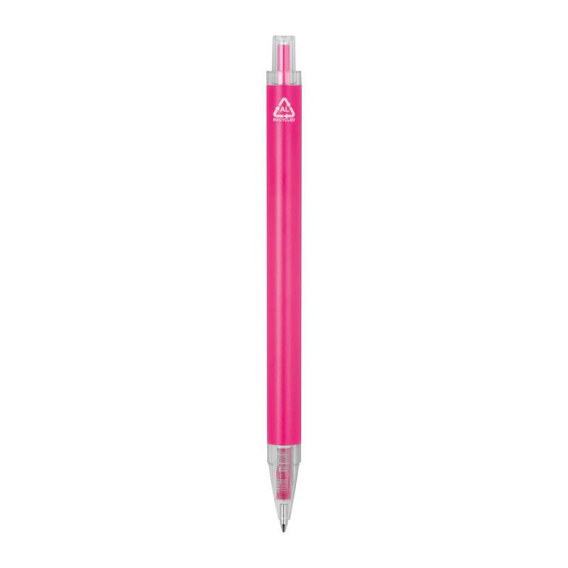 Ballpoint pen made from recycled aluminum and recycled plastic (RPET) with transparent clip and blue ink refill.