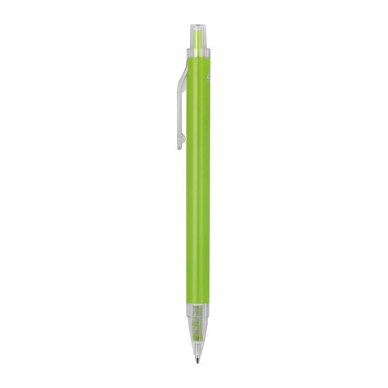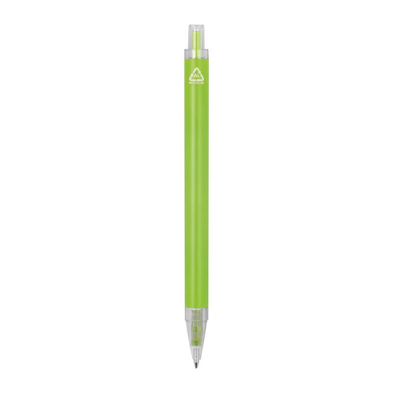 Ballpoint pen made from recycled aluminum and recycled plastic (RPET) with transparent clip and blue ink refill.