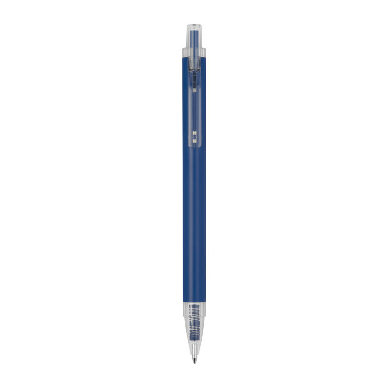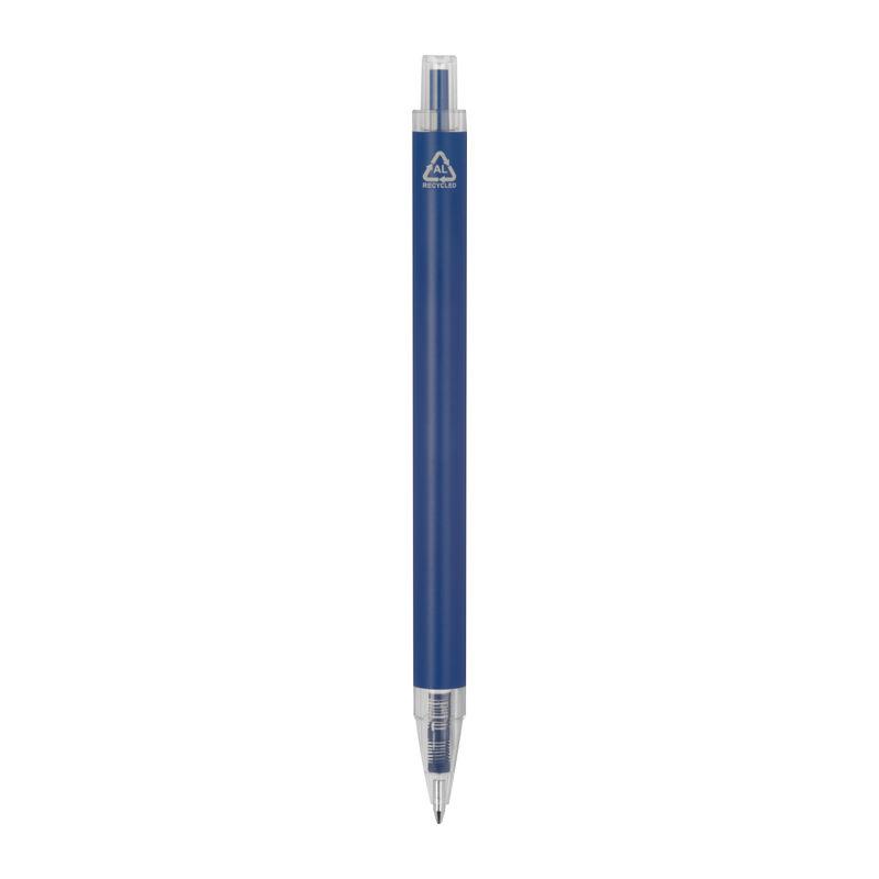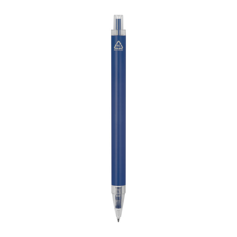 Ballpoint pen made from recycled aluminum and recycled plastic (RPET) with transparent clip and blue ink refill.