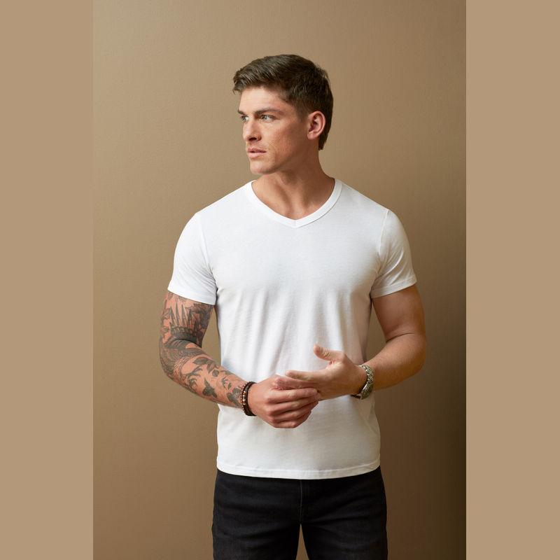 Classic cut V-neck T-shirt for men features collar with rib binding and made of durable single jersey cotton.