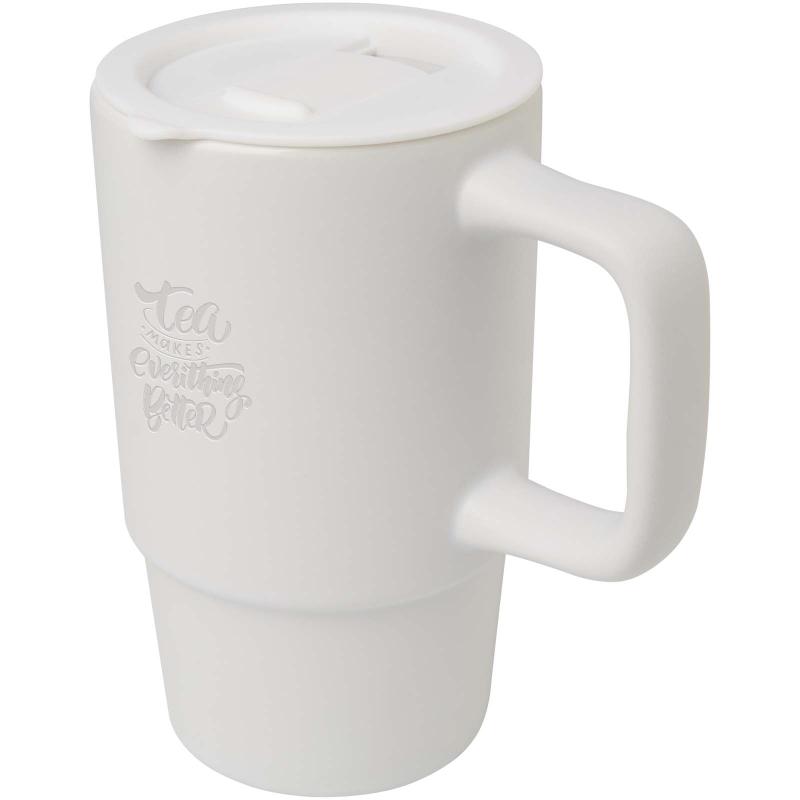 Ceramic mug featuring a large oversized handle for easy carrying, and a spill-proof plastic lid for convenience on the go. The exterior has a stylish matte finish, and the bottle is dishwasher safe for all print methods. Presented in a recycled cardboard gift box. Volume capacity: 450 ml.