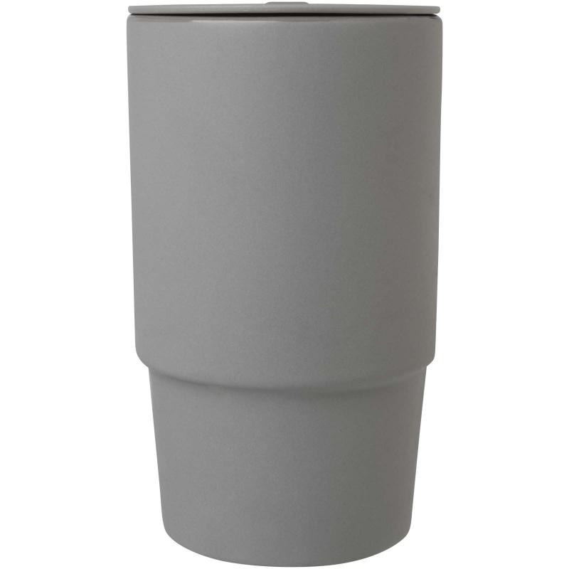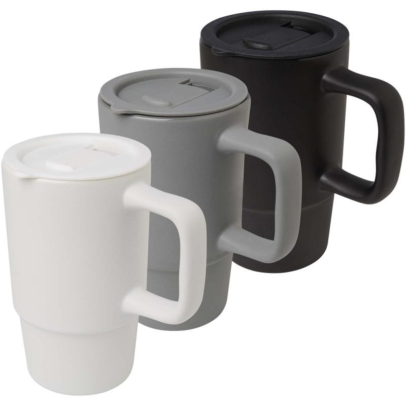 Ceramic mug featuring a large oversized handle for easy carrying, and a spill-proof plastic lid for convenience on the go. The exterior has a stylish matte finish, and the bottle is dishwasher safe for all print methods. Presented in a recycled cardboard gift box. Volume capacity: 450 ml.