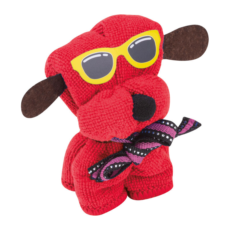 Soft microfiber cloth (20 x 20 cm) folded in the shape of a dog and packaged.