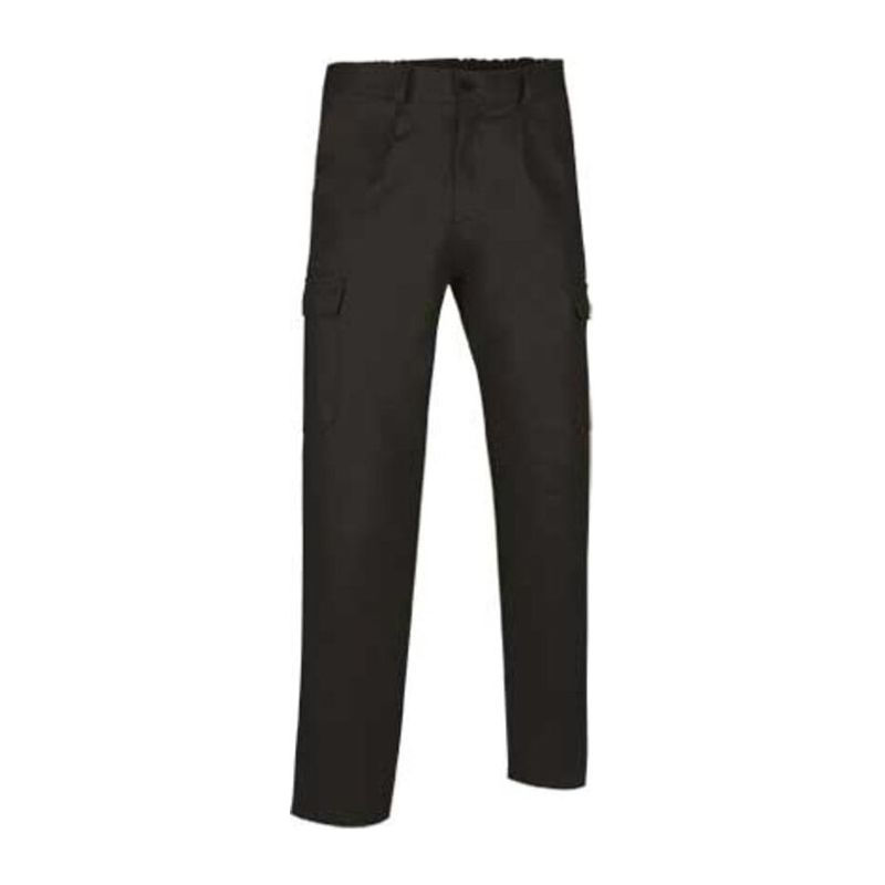 65% polyester, 35% cotton. 210 grs/m² twill fabric. Waist with elastic in back. 2 waist pockets. 2 lateral cargo pockets with velcro. 1 right back pocket. Button and zipper closure. 20 units per box: 1 size, 1 color. Individual bag.
