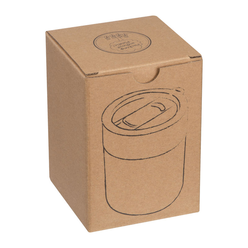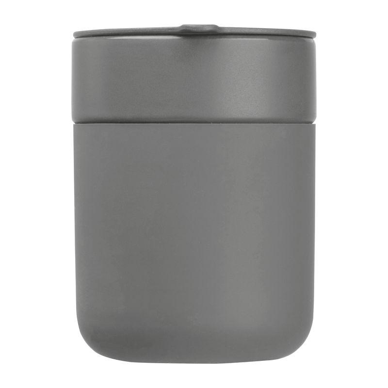 Ceramic drinking cup with silicone sleeve, drinking slide in the lid and 340ml capacity. We engrave your logo on the silicone sleeve.