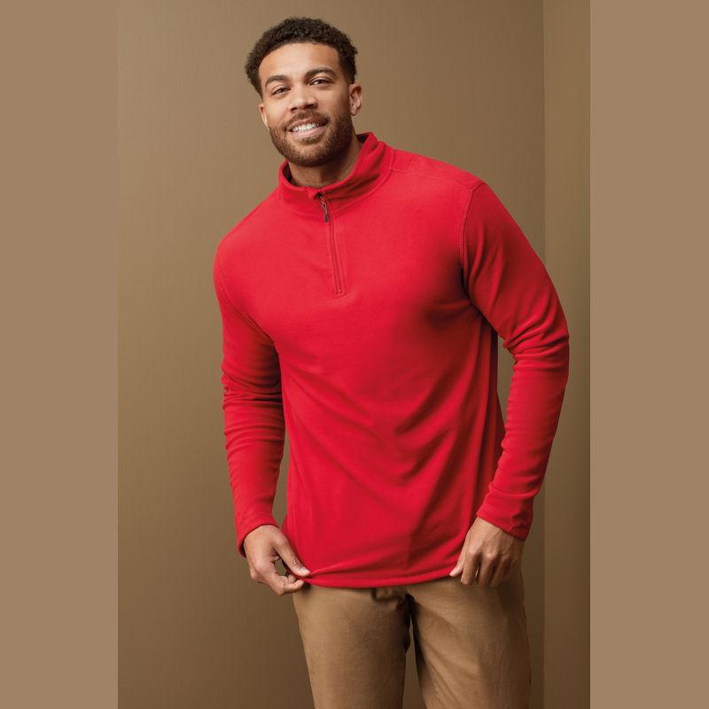 Lightweight and great heat-insulating properties, this men’s fleece pullover with stand-up collar and half-zipper made of breathable micro fleece makes a warm and soft intermediate layer. The hem is adjustable.
