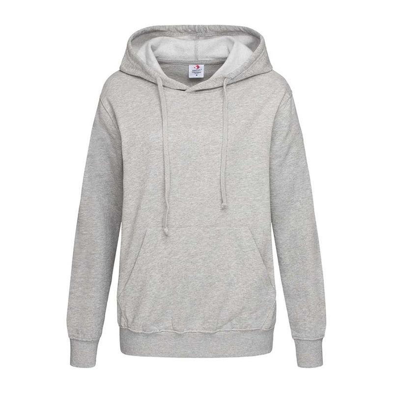 A durable ring-spun cotton-polyester-blend, midweight hooded sweatshirt for women, brushed inside with kangaroo pocket, elastic cuffs and waistband.