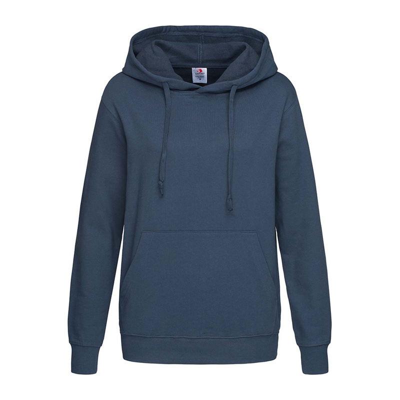 A durable ring-spun cotton-polyester-blend, midweight hooded sweatshirt for women, brushed inside with kangaroo pocket, elastic cuffs and waistband.