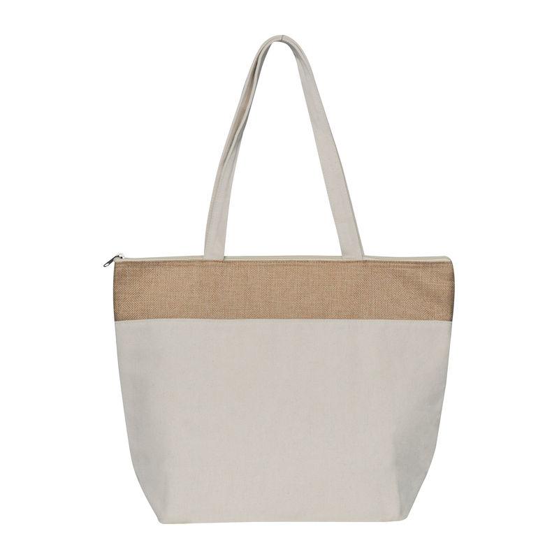 Cooler bag made of 200gsm cotton and laminated jute. With insulating aluminium interior and zipper. Your logo will be printed on one side.