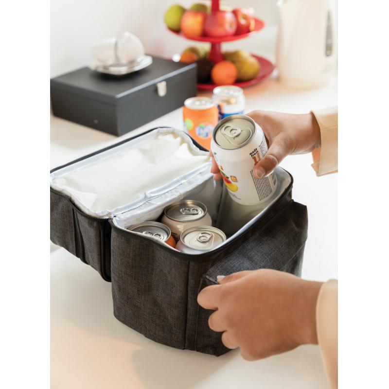 600D polyester cooler with handles and separate compartments. The roomy upper compartment is great for foods like fruit, snacks or cookies. The square bottom compartment is perfect to carry up to 6 cans of drinks. Front zippered pocket is perfect for small accessories such as keys.