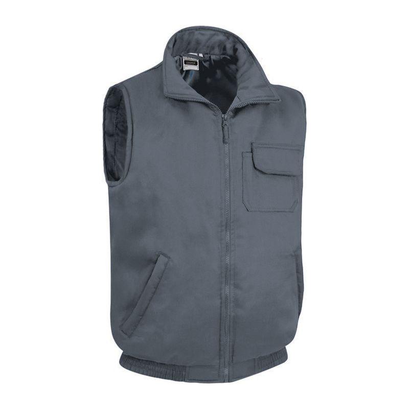 Outside fabric 100% polyester twill fabric 175 grs/m2. Padded 100% polyester 200 grs/m2. Two front zip pockets and 1 left chest flap and pen pocket. 1 inside pocket. Elastic on bottom. Inside back zip for easy embroidering/printing. 20 units per box.