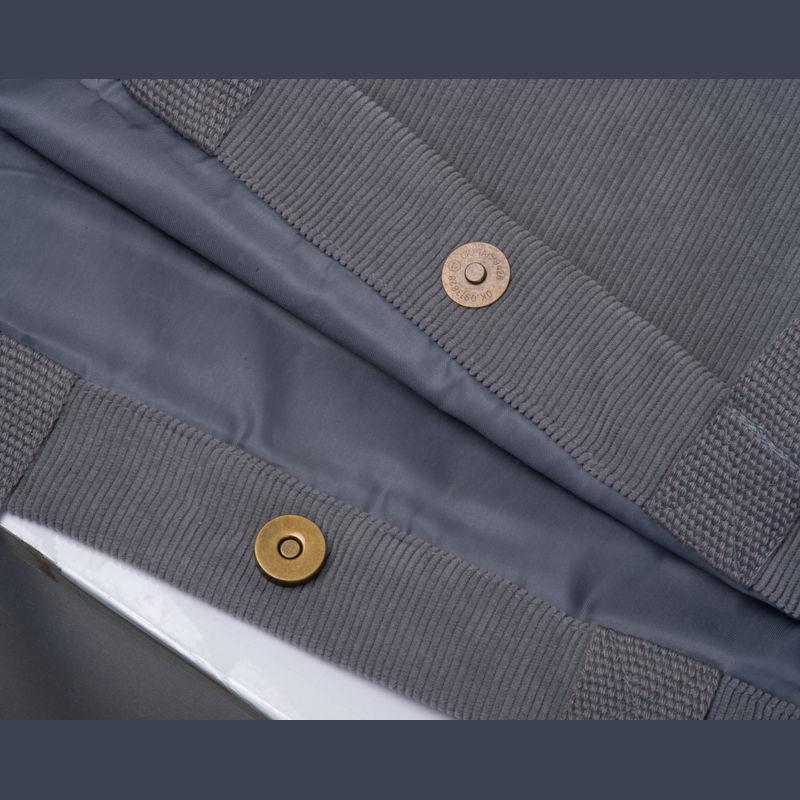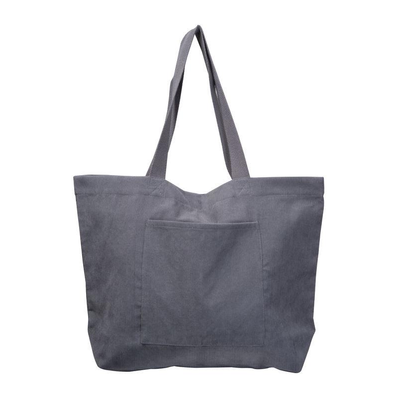 Sturdy shopper made of durable playester cord fabric, 250gsm corduroy (100%) with a front pocket, snap closure, and long, comfortable carrying handles.