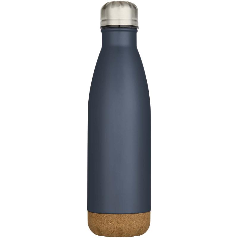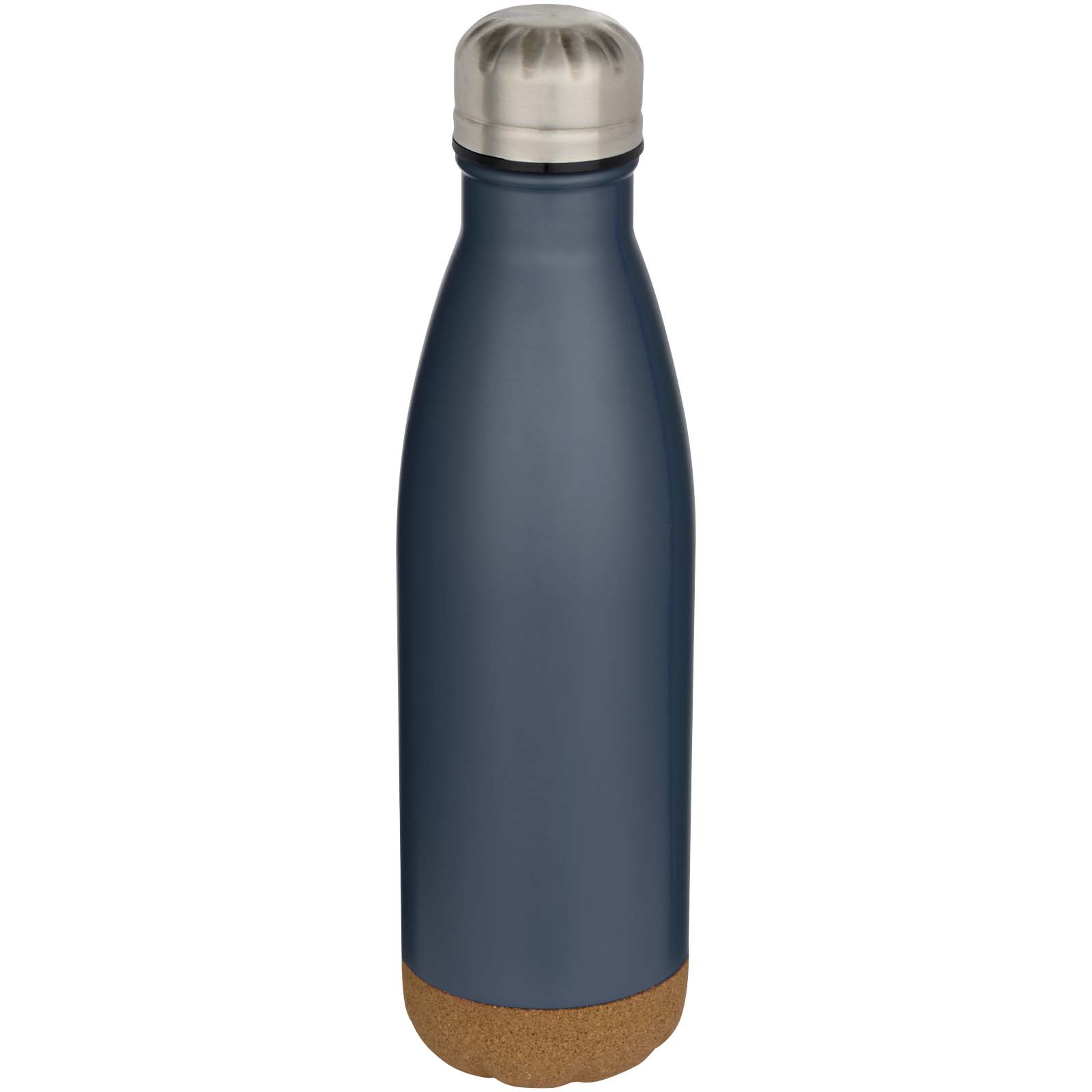 Vacuum insulated stainless steel water bottle with cork details at the bottom. The double-wall insulation keeps drinks hot for 12 hours and cold for 48 hours. Presented in a recycled cardboard gift box. Volume capacity: 500 ml.