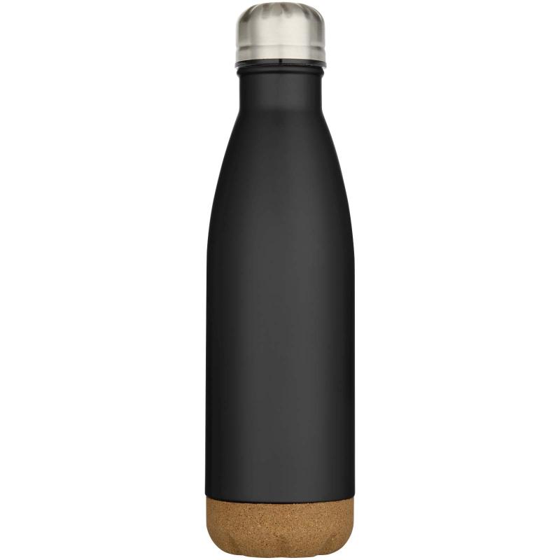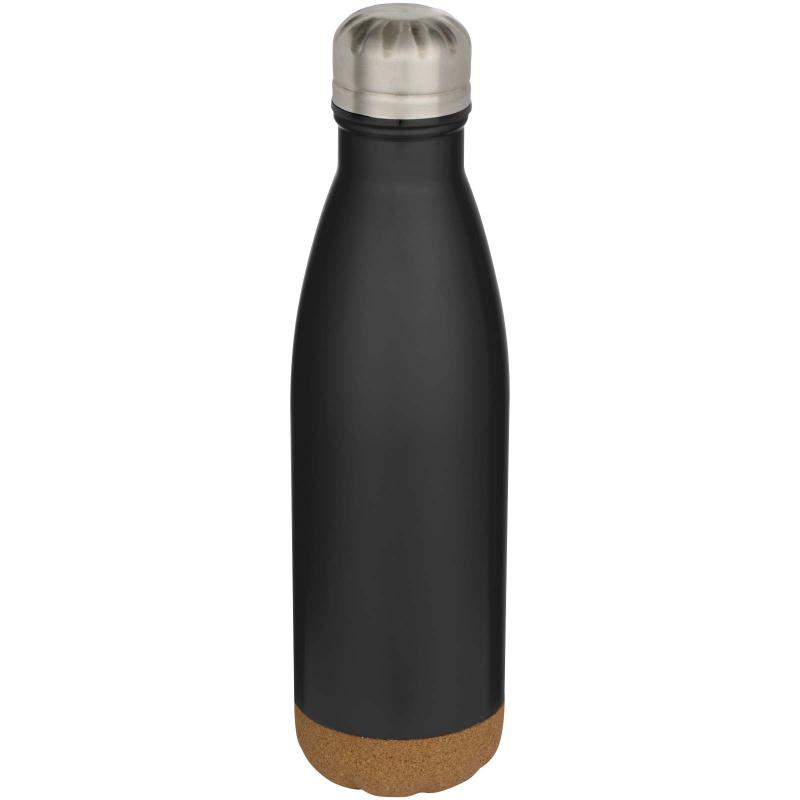 Vacuum insulated stainless steel water bottle with cork details at the bottom. The double-wall insulation keeps drinks hot for 12 hours and cold for 48 hours. Presented in a recycled cardboard gift box. Volume capacity: 500 ml.