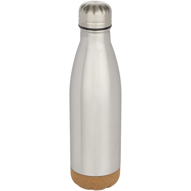 Vacuum insulated stainless steel water bottle with cork details at the bottom. The double-wall insulation keeps drinks hot for 12 hours and cold for 48 hours. Presented in a recycled cardboard gift box. Volume capacity: 500 ml.