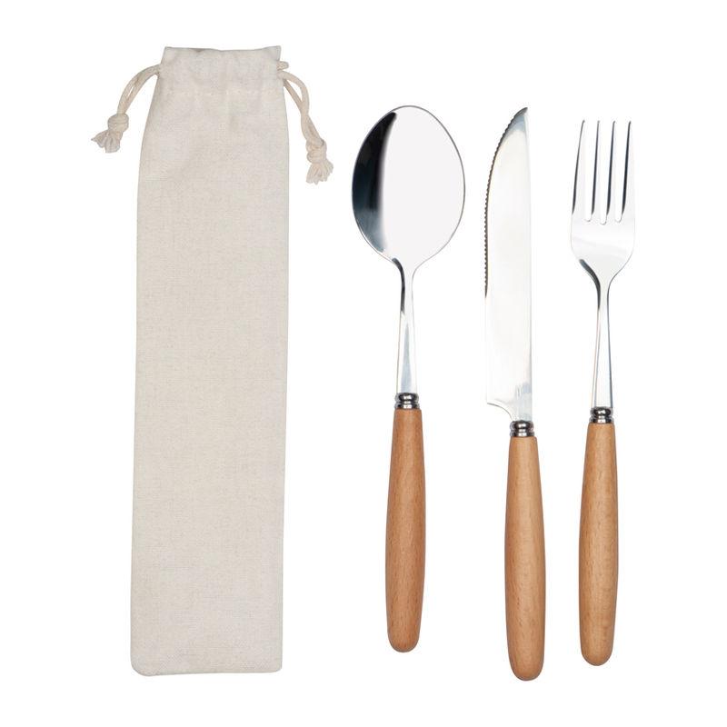Cutlery set consisting of fork, knife and spoon made of wood and stainless steel in a lockable cotton pouch. Your logo will be printed on the pouch.