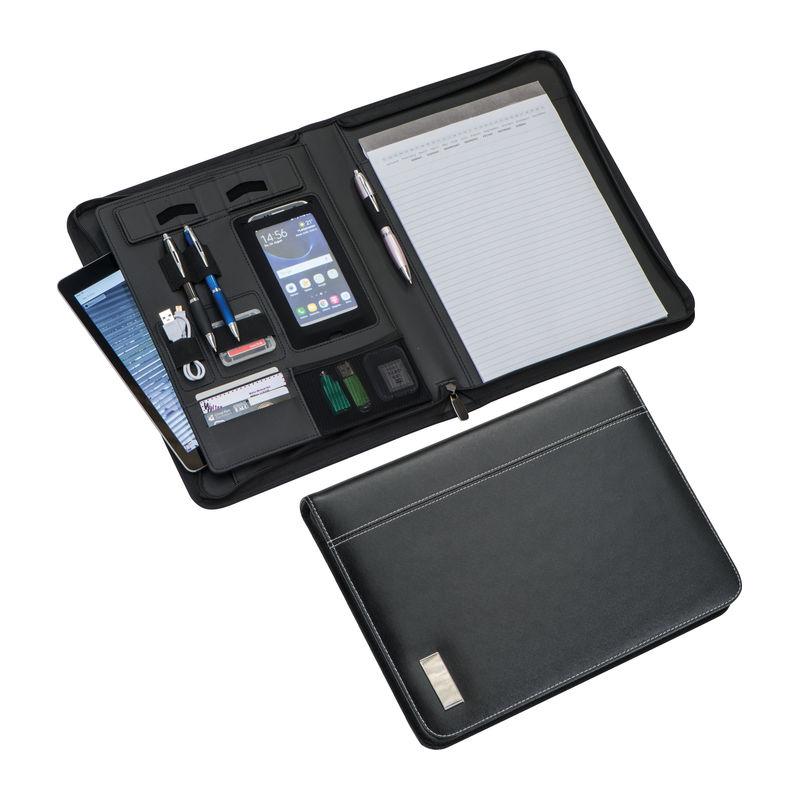 A4 folder made of imitation leather, with business card slots, pen loop, smartphone holder and stand, and lined block with a small calendar impression. We will engrave your logo on the outer metal plate.