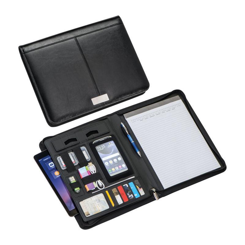 A4 folder made of imitation leather, with zipper, slip pocket, business card slots, pen loop, smartphone holder and stand, compartment for tablet or notebook, and lined block with a small calendar impression. We will engrave your logo on the outer metal plate.