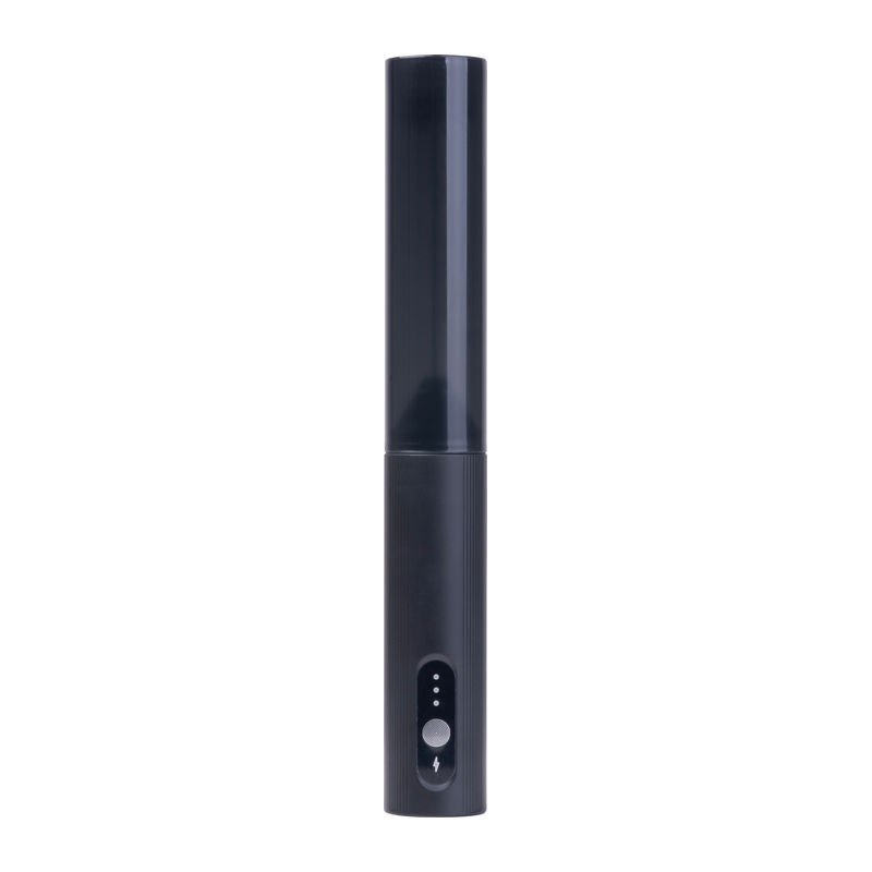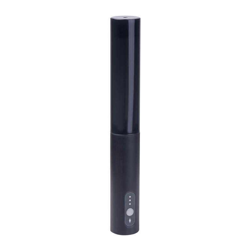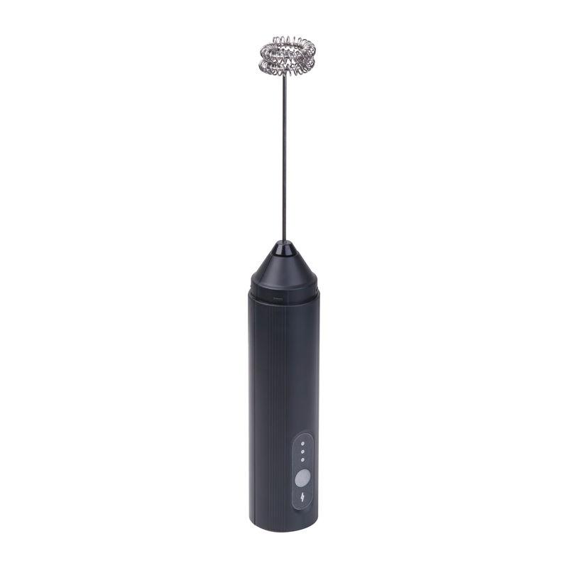 Electric milk frother (3 watts) with rechargeable battery (300 mAh) and protective sleeve, including charging cable. Made of ABS and stainless steel.