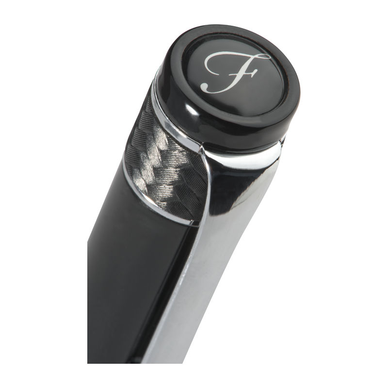 Luxurious Ferraghini ball pen with twist mechanism. The combination of black-lacquered surface and cloth cover in braided design is highlighted by occasional chrome accents. The blue-writing metal ball pen is stored in a velour padded artificial leather case with magnetic closure. We will engrave your logo to the right of the clip.