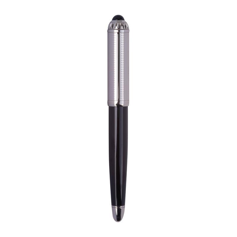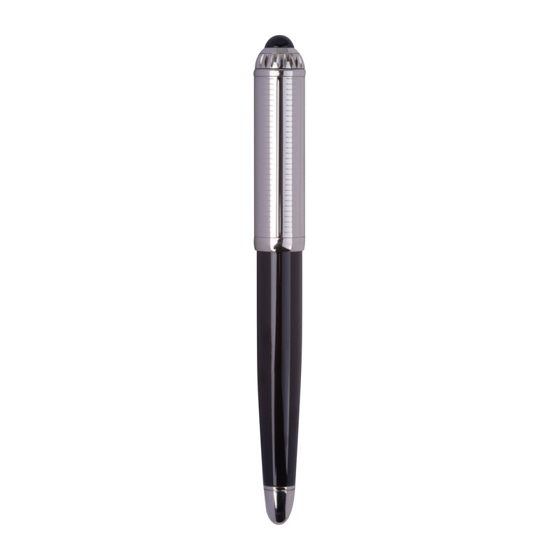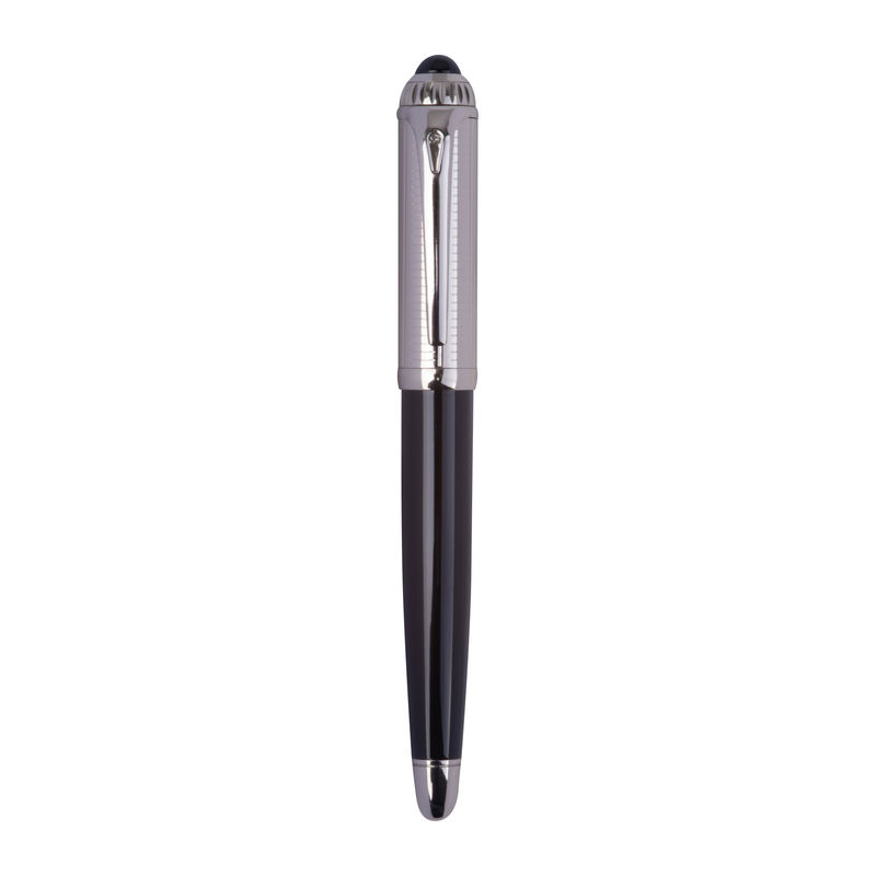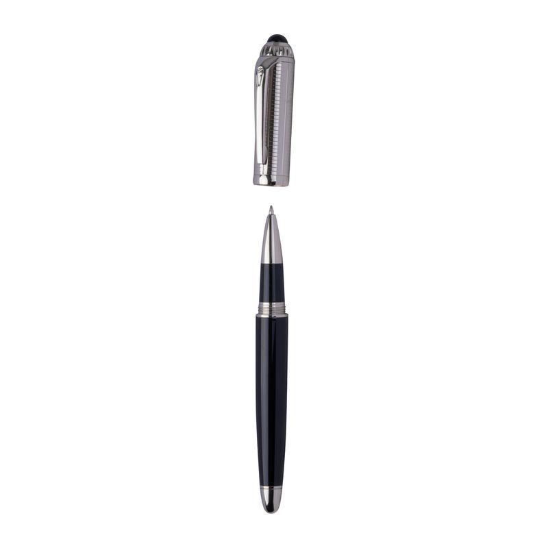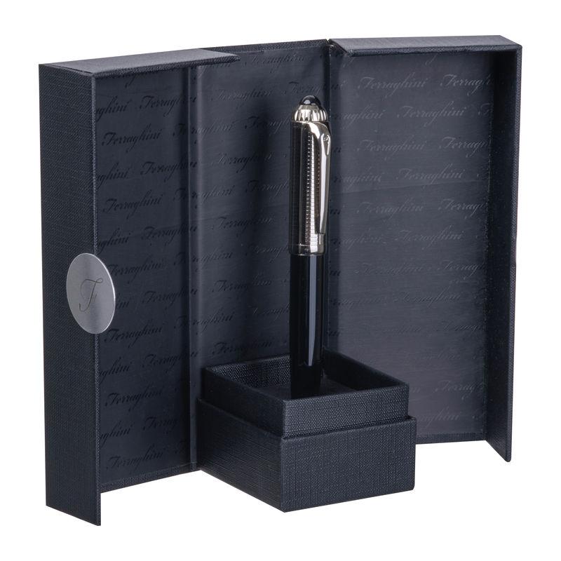 Blue-writing Ferraghini rollerball pen made of stainless steel, featuring the distinctive “F” on the clip top and a writing length of up to 400 m. Packaged in a high-quality box matching the pen.