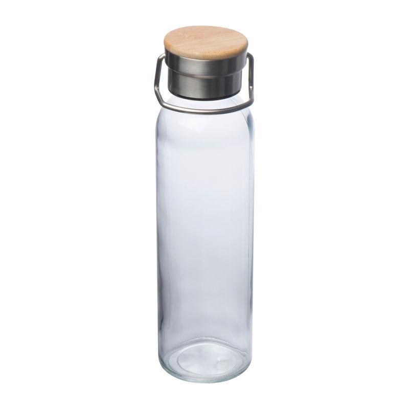 Glass drinking bottle with neoprene sleeve, stainless steel lid with bamboo top, carrying handle and a capacity of 600 ml. Your logo will be printed on the cover.