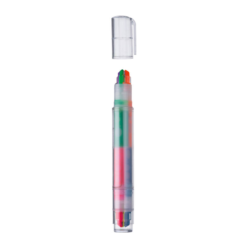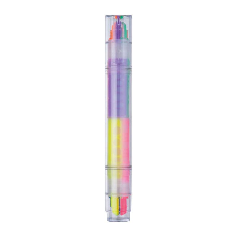 Highlighter set with 6 different colors made of plastic. Three colors on each side.