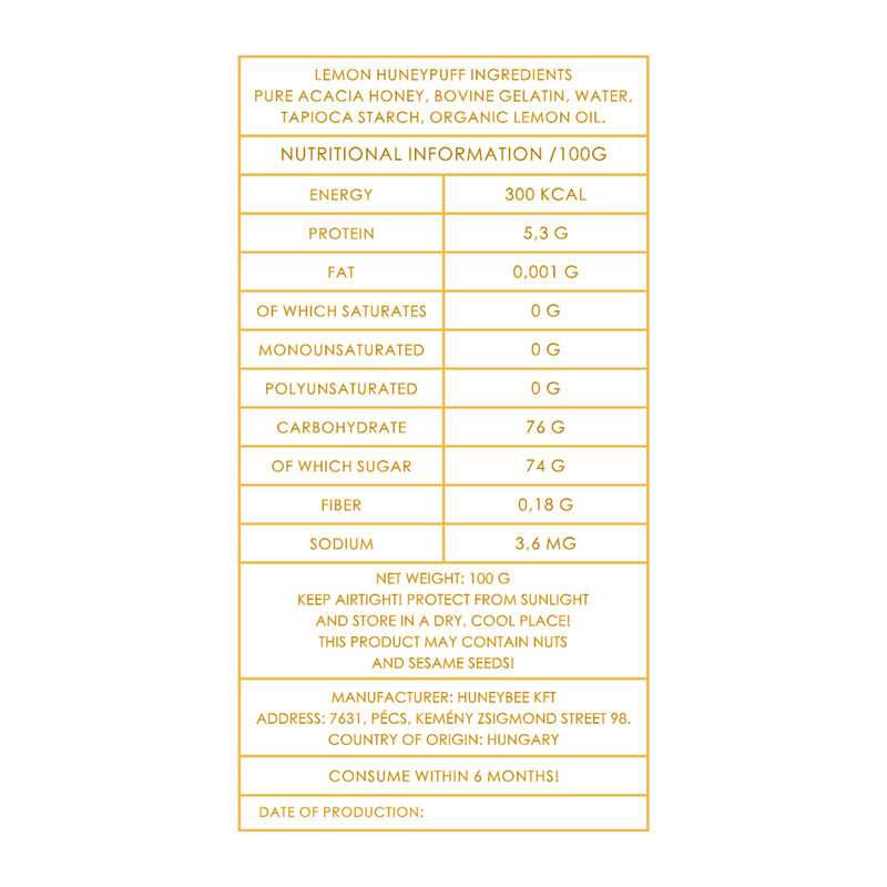 Discover the new dimension of honey consumption with these natural HoneyPuffs. Huneybee is a family-owned business reimagining traditional honey consumption. We address a fundamental market challenge that has long limited the use of honey: its stickiness and difficulty in portability. We've uniquely transformed honey into a light yet solid form, allowing you to take nature's golden treasure with you wherever you go. We are committed to providing a healthy alternative amongst highly processed sweets. Thanks to our gentle process, our product preserves the valuable enzymes and vitamins found in acacia honey, so its consumption not only provides enjoyment but also naturally supports your body. We don't use any artificial additives, added sugars, or preservatives during production. It's just honey, as nature intended it; we only gave it a new form. Curious how to consume it? HoneyPuffs are perfect on their own, but they can be a healthy snack for kids or an ideal choice for adults who crave a quick and delicious energy boost. You can liven up your breakfast with it, and it can even be a special flavoring for lukewarm drinks. Lemon: A refreshing flavor profile where the sweetness of honey is complemented by the natural tart notes of lemon.The price listed includes a label with a unique label for orders over 50 pieces. For orders under 50 pieces, please request a unique price for the label.