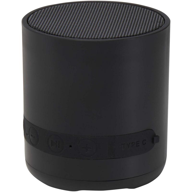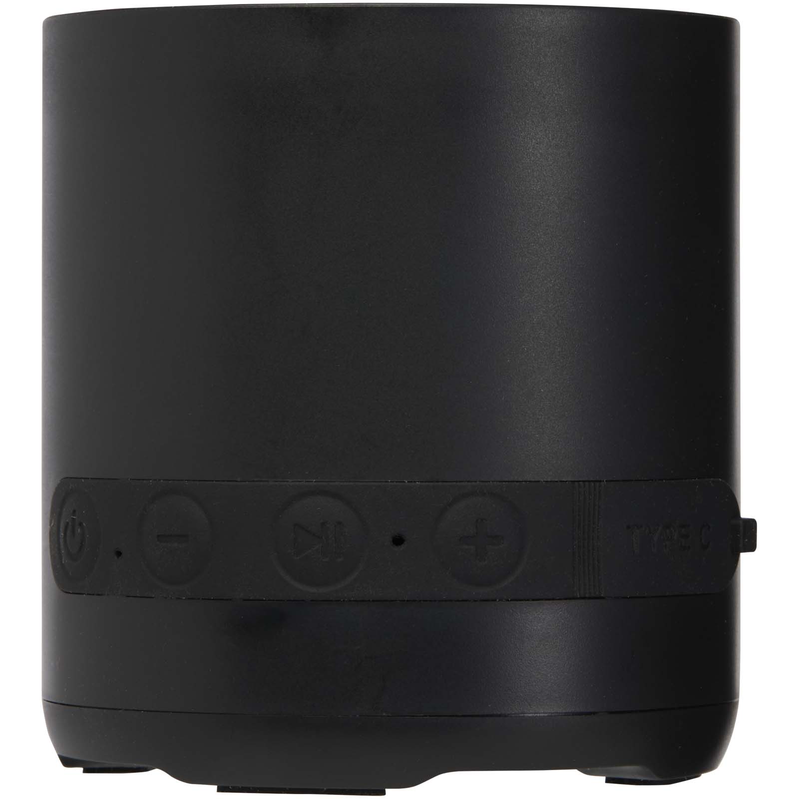 The Hunor 3W wireless Bluetooth® speaker is made from recycled plastic, and features a Type-C charging port, volume controls, a Play/Pause/Call button, and a built-in microphone. Thanks to the TWS (True Wireless Stereo) functionality, you can pair two speakers for a stereo sound experience.