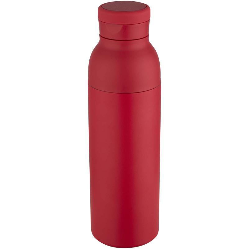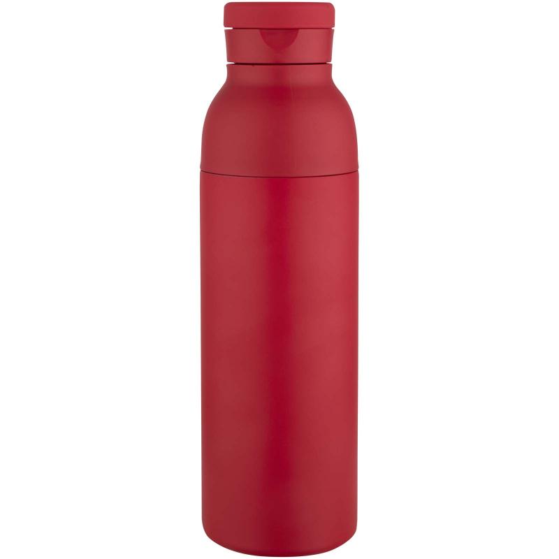 Double-walled, vacuum-insulated, RCS certified stainless steel water bottle featuring a discreet built-in silicone handle within the lid. The two-piece construction makes cleaning easy, while the durable powder coating and copper plating ensure long-lasting performance. Presented in a recycled cardboard gift box. Volume capacity: 650 ml.