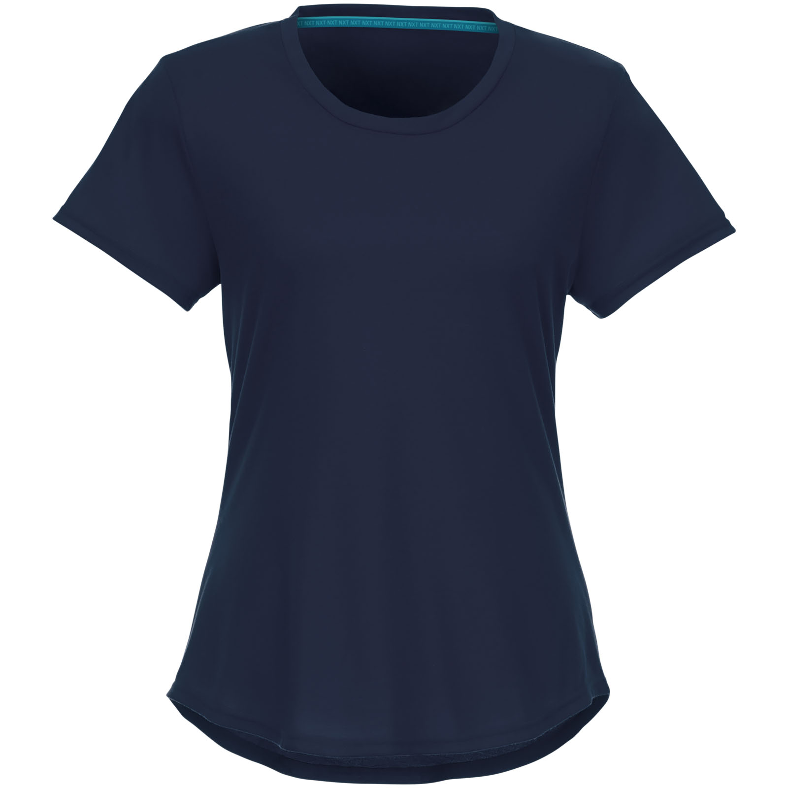 Sustainable promotional apparel. Scoop neck. Side seams. Dropped back hem. Shoulder to shoulder tape. Double needle stitching detail.